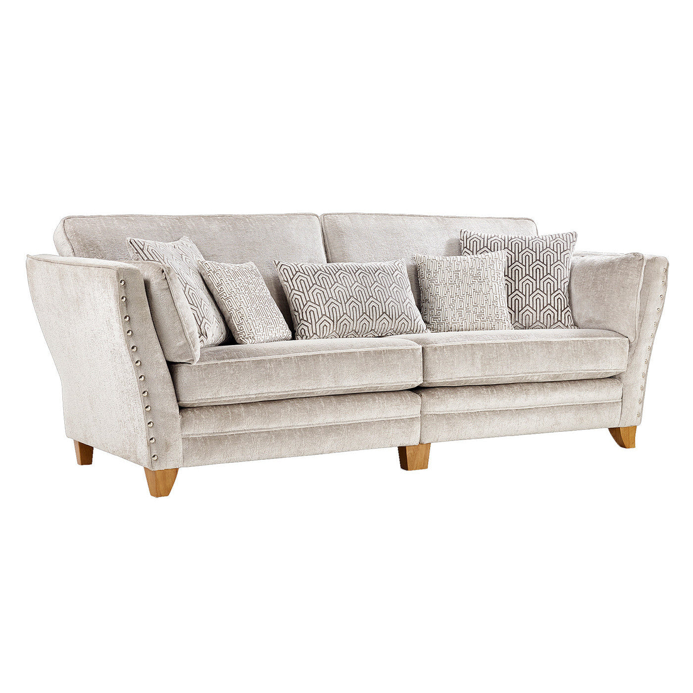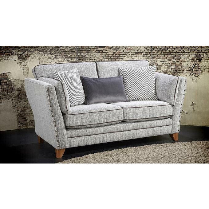 The Athena is a glamorous, industrial style model which adds luxury to any living space. The elegant curved arms create a bold silhouette which is emphasised by metal studs lining each arm outer edge. Soft bolster cushions fit the curvature of the arms to provide luxurious comfort at all times. The metal studs allow the Athena to be perfectly paired with silver home accessories, setting the scene for a sophisticated and glam interior. As well as this, the studded arms allow industrial accents to sit perfectly alongside this model. This timeless design with perfect lines and proportions, featuring beautiful fabrics, both tactile and soft combination of velvet and chenille. High arms cushioned by soft bolsters to wrap you in stylish comfort, the glorious finishing touches are the stunning metal studs shinning like jewels.
