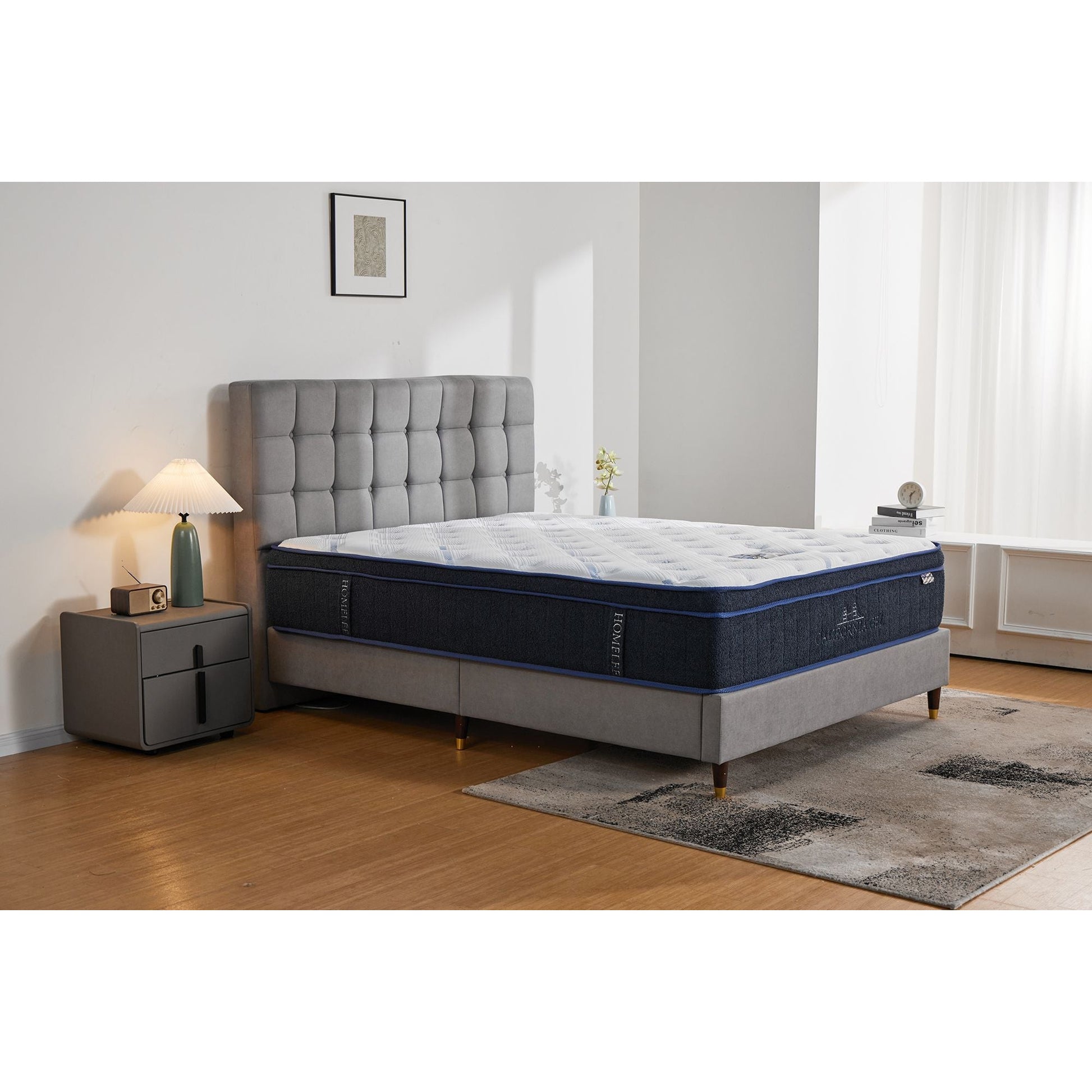 The California Gel mattress is a stunning addition to your sleeping environment. Integrated with modern technology, the California mattress' hand woven seams combined with its exclusive touch-knitted fabric allow the sensation of an elegant and comfortable texture. Its deep navy colour adds visual aesthetic to rooms looking for a modern elegant touch. This mattress is further enhanced by its cool gel plush fabric researched and developed by Homelee. Unlike standard memory foam, this technology works multiple times faster by absorbing excess heat when you're too hot or releasing stored heat when you're too cold. All of these combined features help to keep you comfortable for a long night's sleep every night. On top of everything, cool gel is also chemical free, meaning it's much safer and better for the environment too. This mattress has been exclusively designed in the United States for the Irish market.