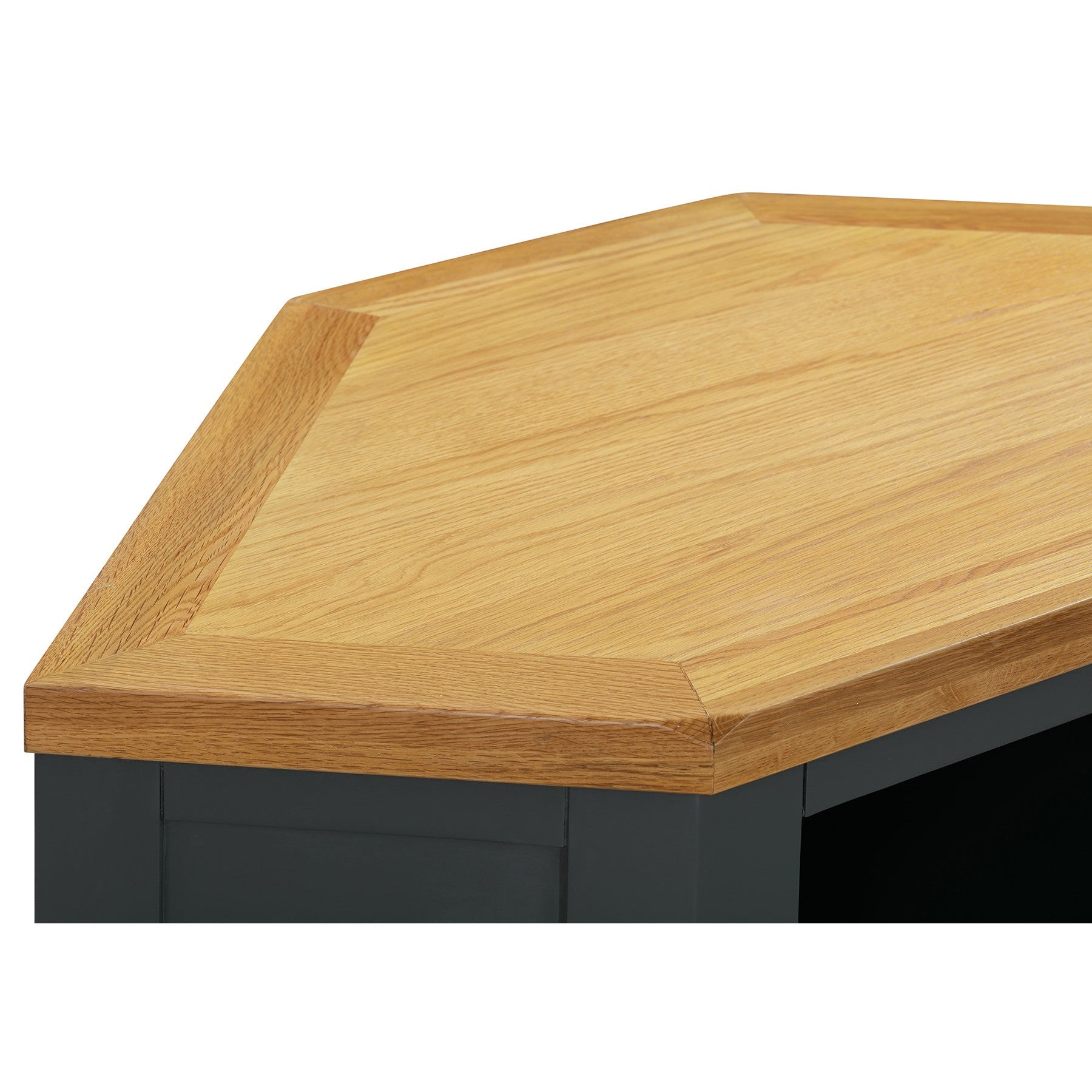 Every living room needs a TV unit and this one combines on-trend style - that midnight blue painted and oak finish! - with everyday practicality. Large in scale, with its understated contemporary style with an on-trend oak and midnight blue painted finish, this oak corner TV unit showcases impressive craftsmanship with its generous proportions. Exclusively available at Caffrey's Furniture!