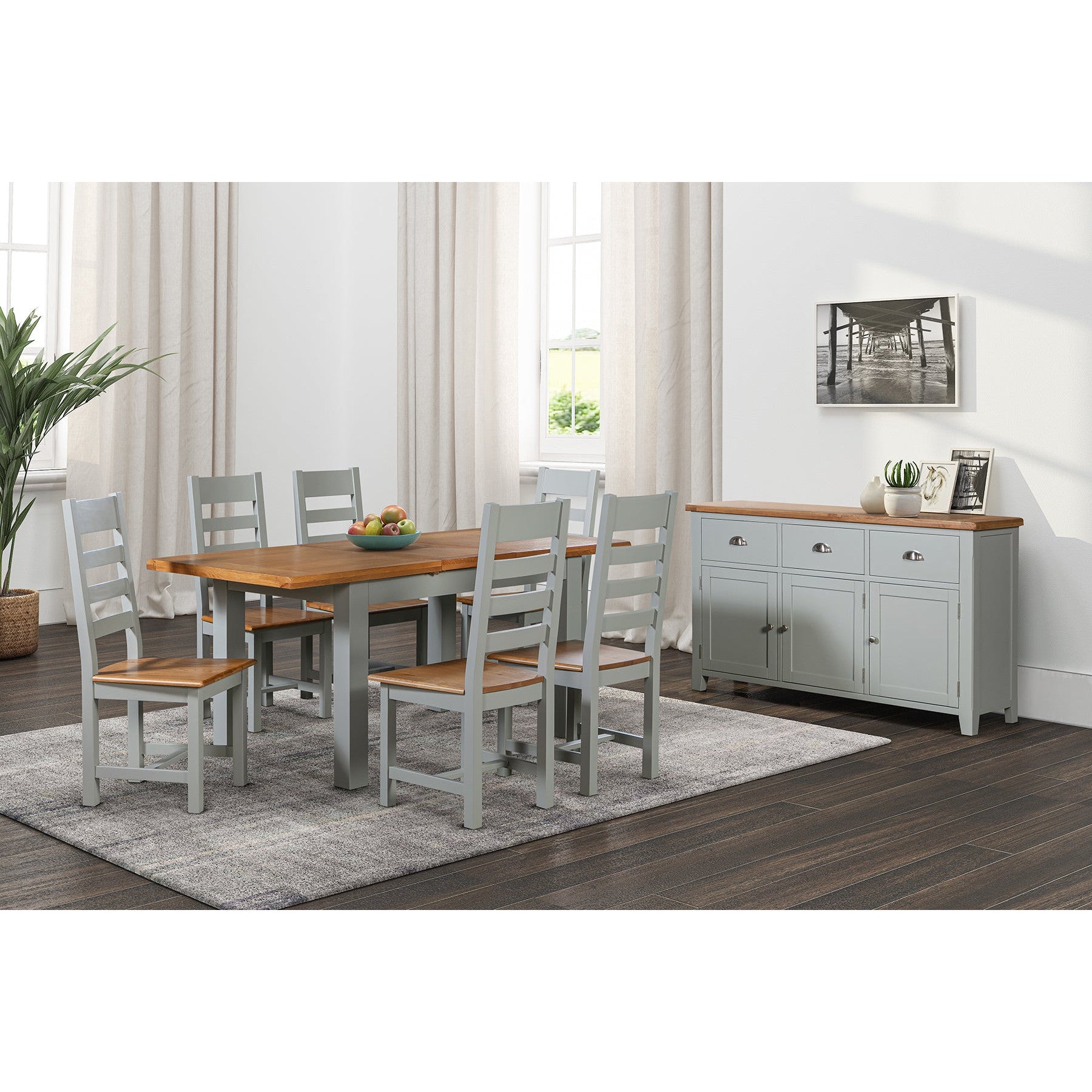 The two-tone oak and mushroom grey painted finish elevates this well-crafted dining table to a statement piece of contemporary furniture. And as it extends to seat 6 there’s plenty on-trend style to go round. With its understated contemporary style with an on-trend oak and mushroom grey painted finish, this extending dining table showcases impressive craftsmanship with its generous proportions is perfect for entertaining. It extends to seat six with a hidden butterfly extension mechanism. Why not pair this with either the Capri fabric or solid seat chair.