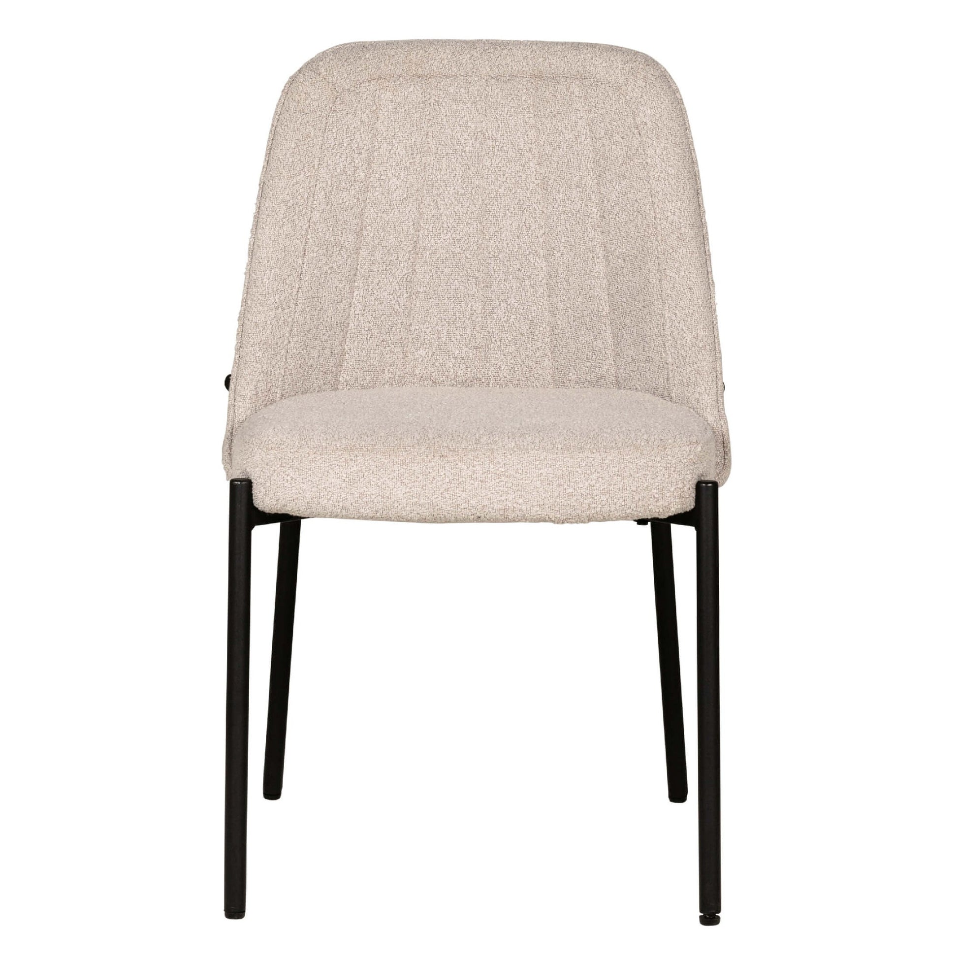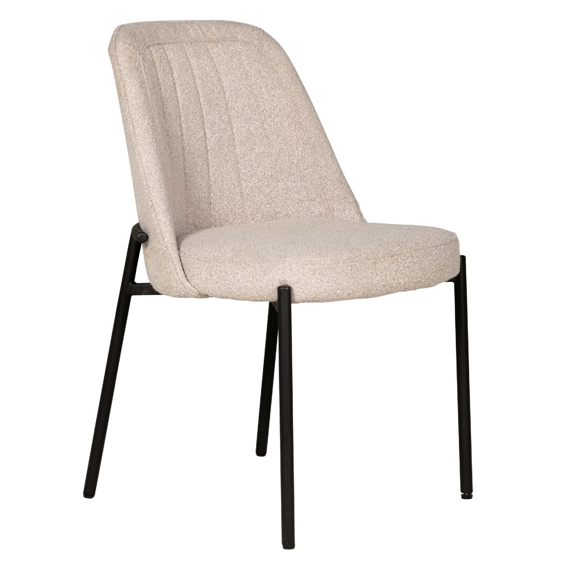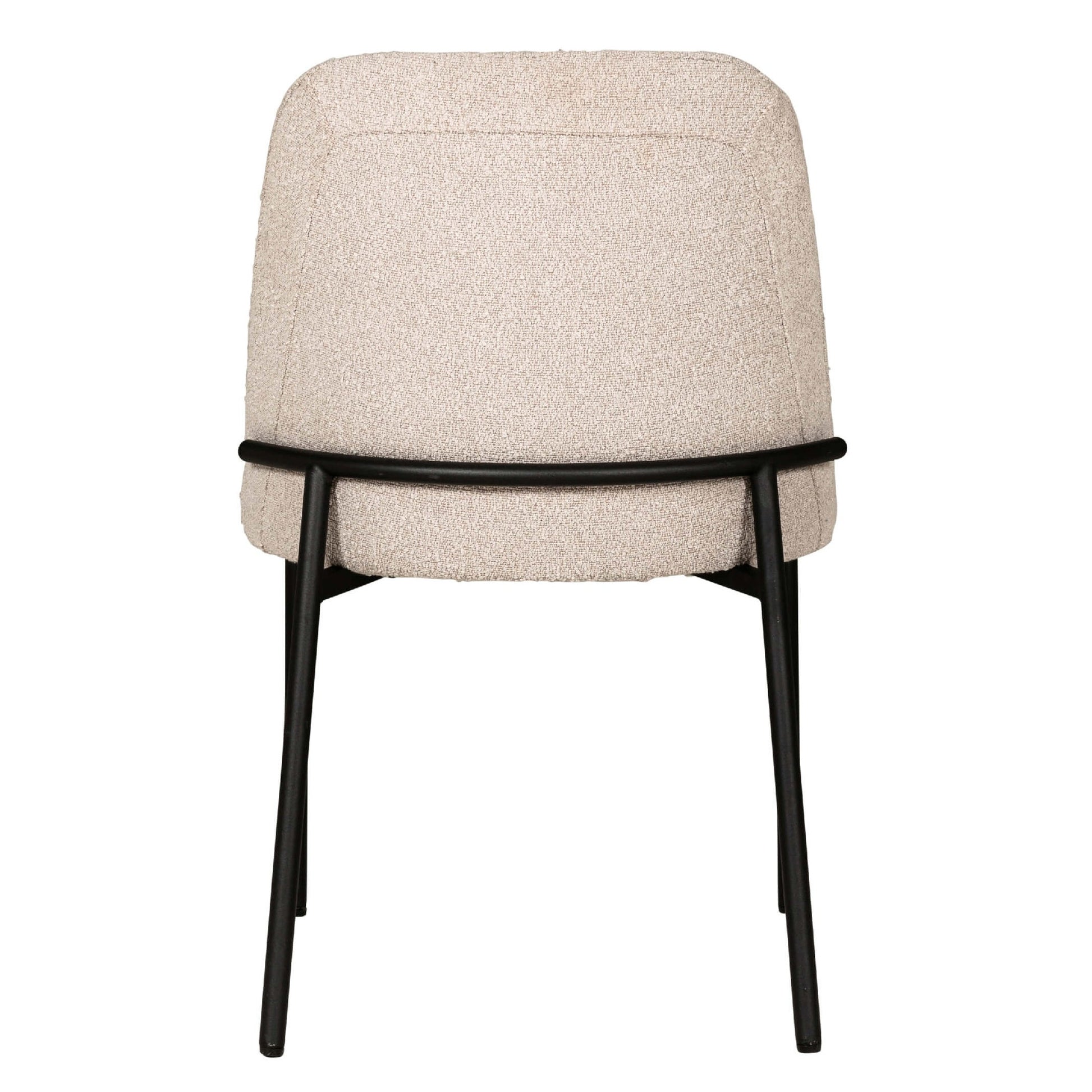 The Field dining chair is upholstered in a modern boucle fabric, complementing a range of kitchen decors. It adds texture and sophistication to the space, with the addition of sturdiness and a contemporary style from its black metal legs.