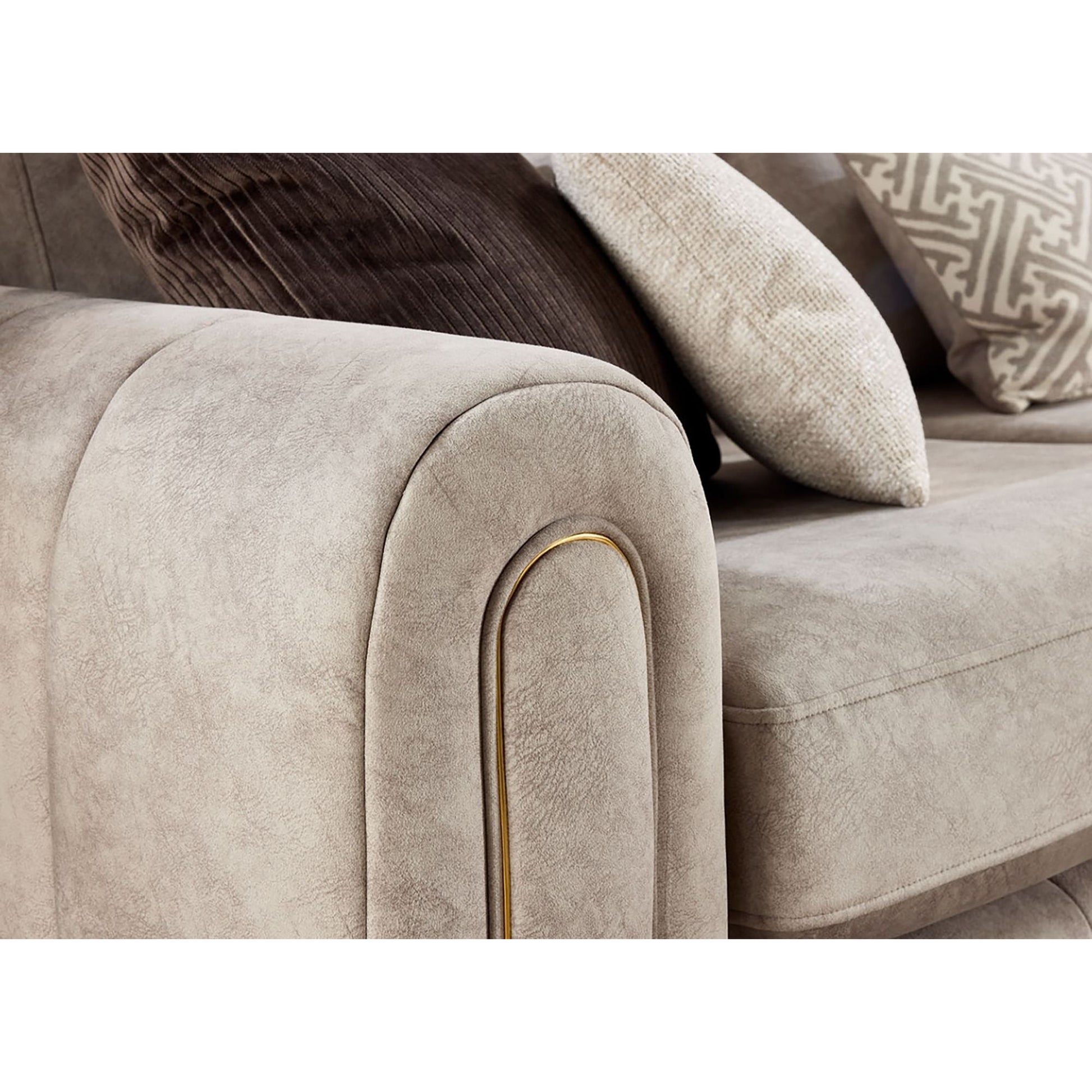 The Glamour collection epitomises everything Glamourous, elegant lines, plush sumptuous body fabric, sophisticated accent cushions all finished off with rich gold piping details framing the front arm facing. The model has striking features, as well as the gold piping on the arms. The front border is quilted offering drama and comfort, it's generous proportions allowing you to chill out in style. The Glamour has an Art Deco influence which is evident in the dome design shape of the arms and layered facing, the low wooden foot is this models finishing touch.