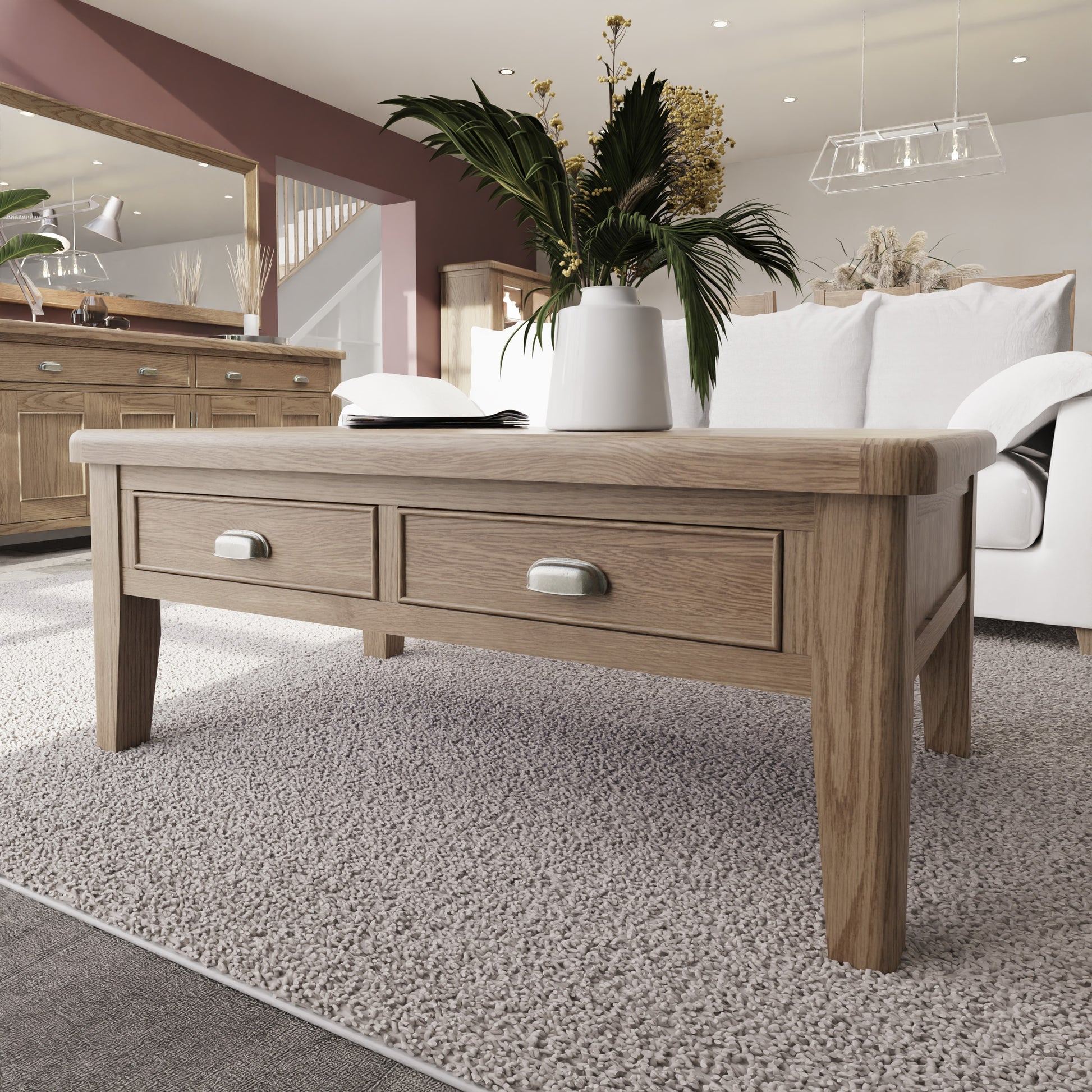 The Hodson Oak Coffee Table features a timeless, classic design with clean lines and a solid, well-proportioned silhouette. Crafted with a natural wood finish that highlights the grain, it brings warmth and character to any interior. The design balances practicality and style, combining smooth surfaces with subtle detailing and traditional-style handles for an understated, elegant look. Its sturdy construction and versatile appearance make it suitable for a wide range of rooms and décor styles, from traditional to contemporary living spaces.