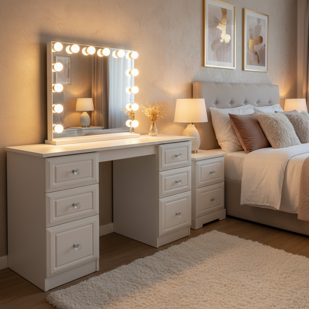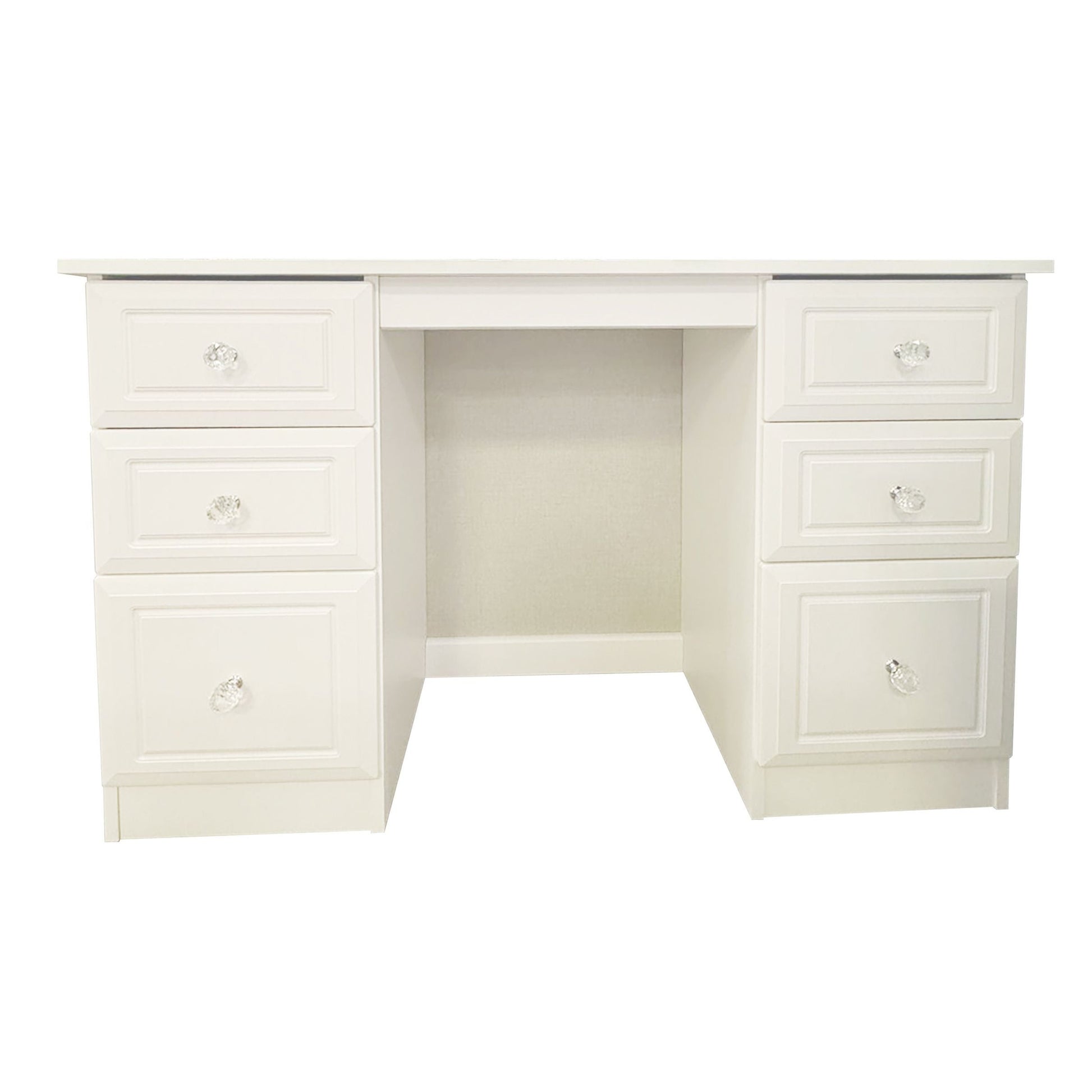 The Snowdon White Kneehole Desk is a neat, stylish dressing table with crisp clean edges and is a perfect fit in any bedroom. Subtle detailing results in a beautiful vanity which coasts three white wood effect drawers, tops and internals. It boasts lovely crystal handles for a touch of class. It is a perfect match with any other bedroom furniture in the Snowdon Range. This dressing table is quality made and is delivered fully assembled.