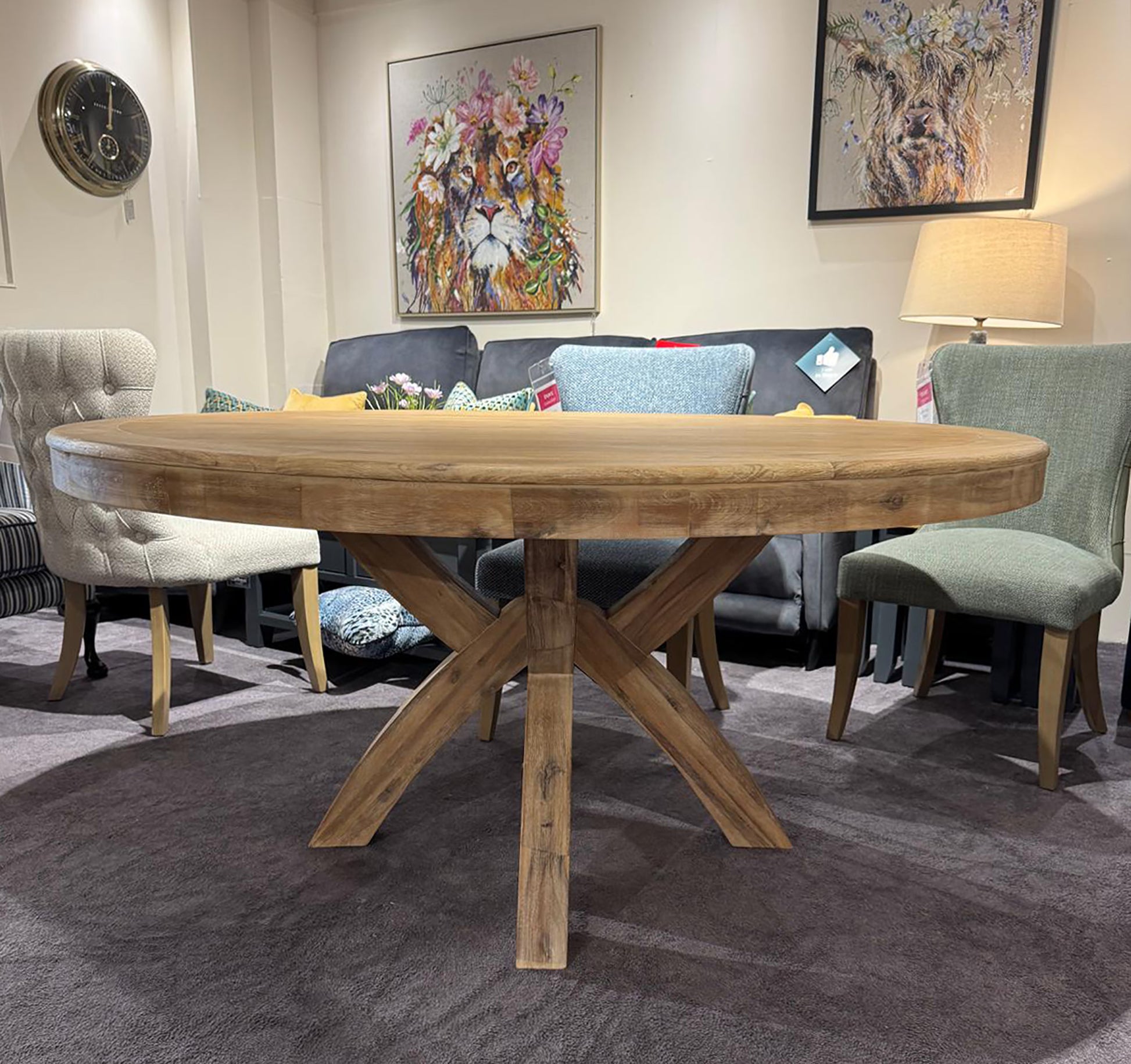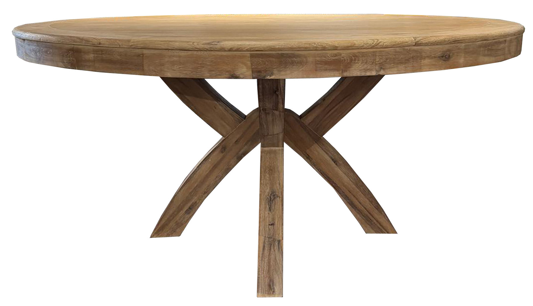 The Lexington Round Washed Dining Table boasts oak wood with a prominent silvery grain and a crossed leg design. A classic statement piece, it enhances rustic accents in dining spaces with its robust construction.