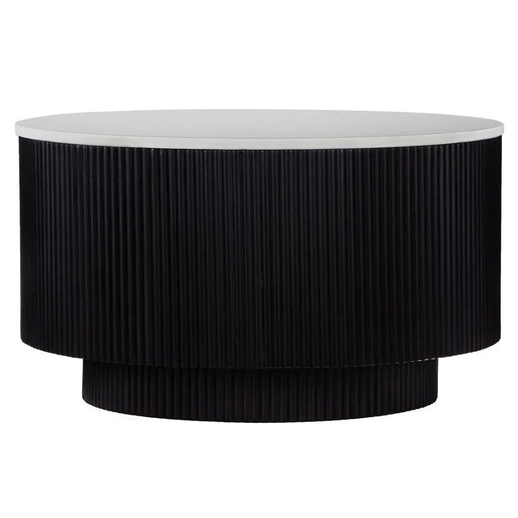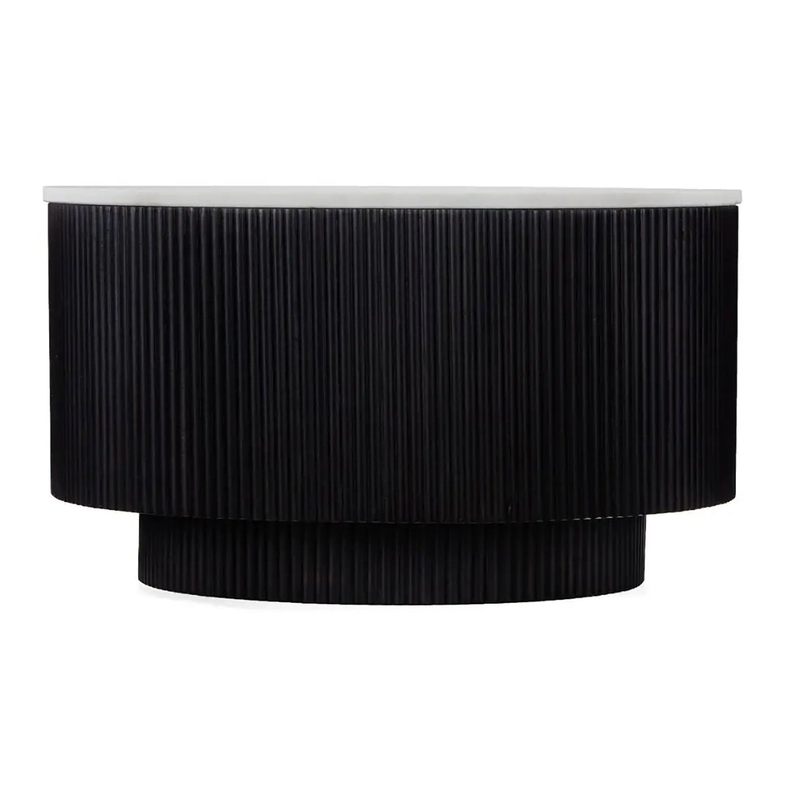 Our Lucas Round Marble Coffee Table accentuates its racetrack curves with dynamic ribbing. Multiple finishes provide harmonious contrast, tinting the solid mango charcoal along with a natural hue top with a beautiful marble pattern. A black-finished mango wood ribbed drum base is elevated to complement the rounded silhouette.