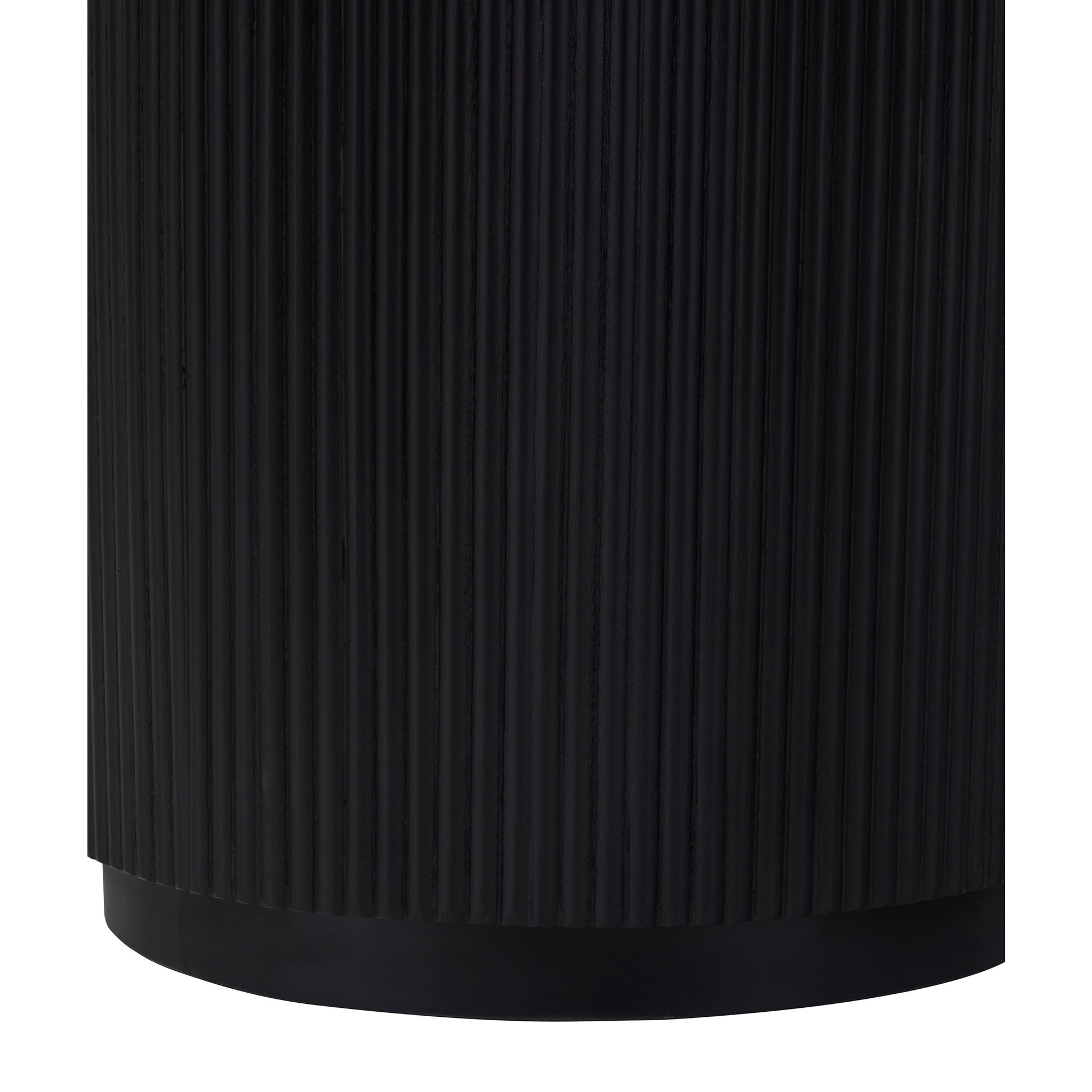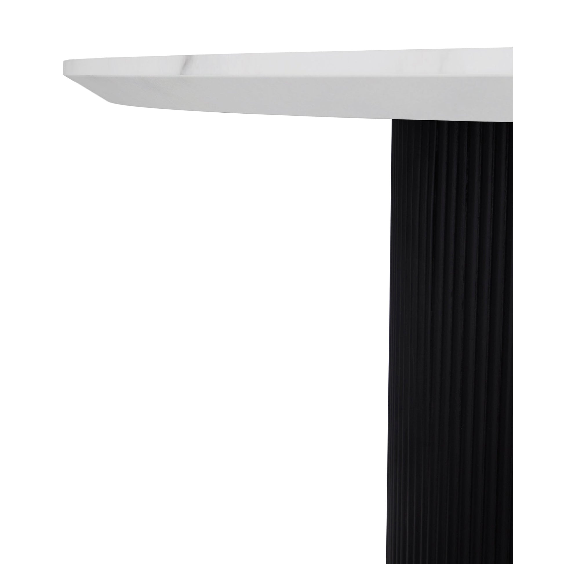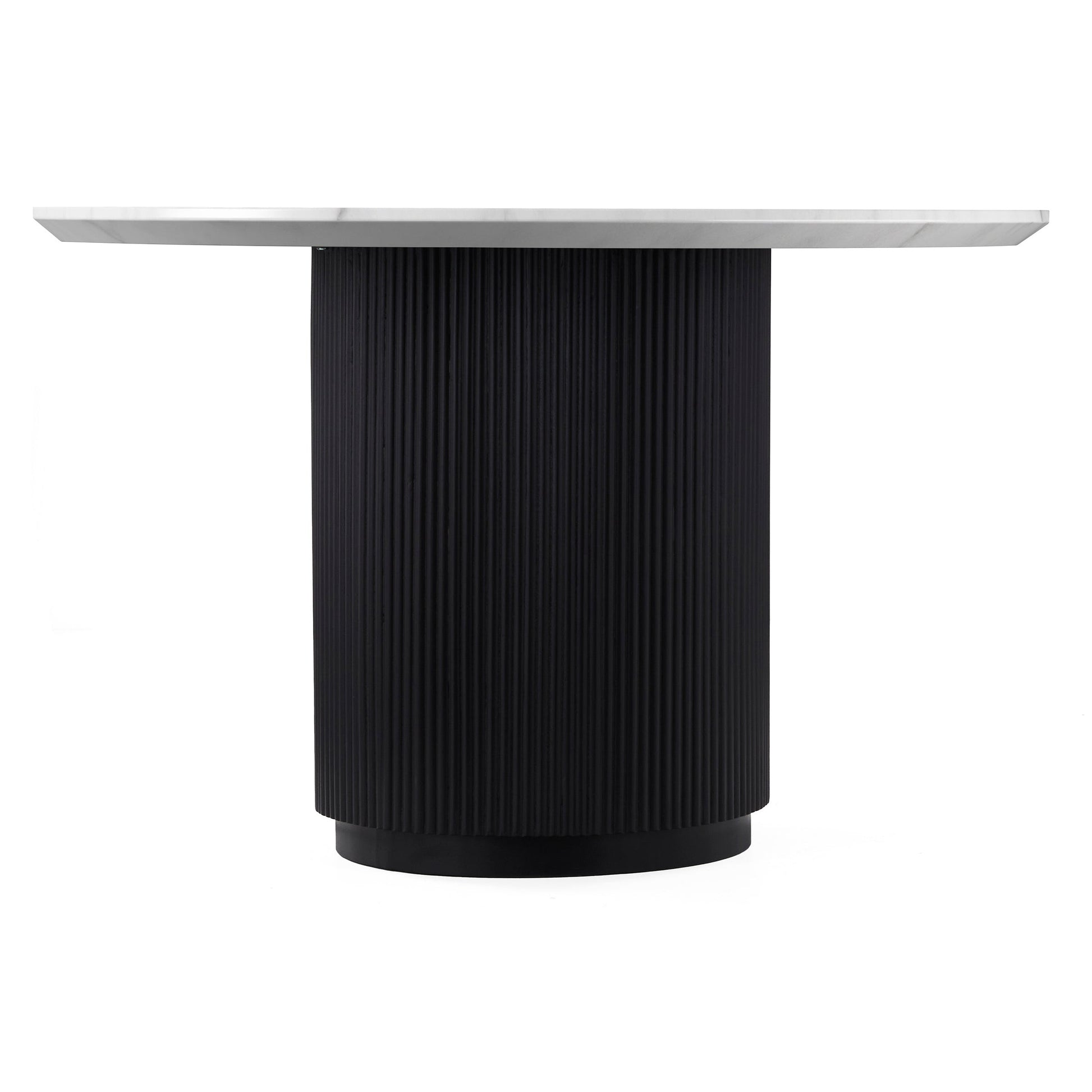 Our Lucas Marble Dining Table accentuates its racetrack curves with dynamic ribbing. Multiple finishes provide harmonious contrast, tinting the solid mango charcoal along with a natural hue top with a beautiful marble pattern. A black-finished mango wood ribbed drum base is elevated to complement the rounded silhouette.