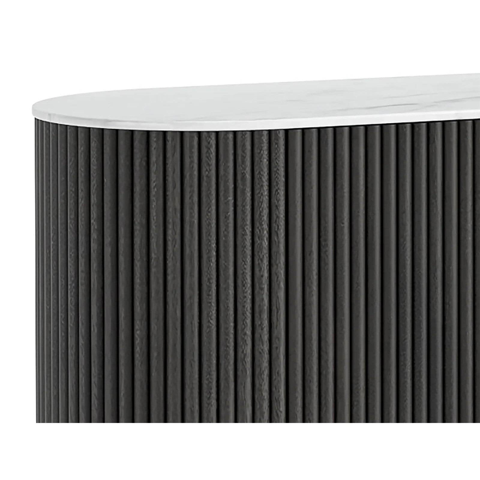 Our Lucas Marble Small Sideboard accentuates its racetrack curves with dynamic ribbing. Multiple finishes provide harmonious contrast, tinting the solid mango charcoal along with a natural hue top with a beautiful marble pattern. A black-finished mango wood ribbed drum base is elevated to complement the rounded silhouette.