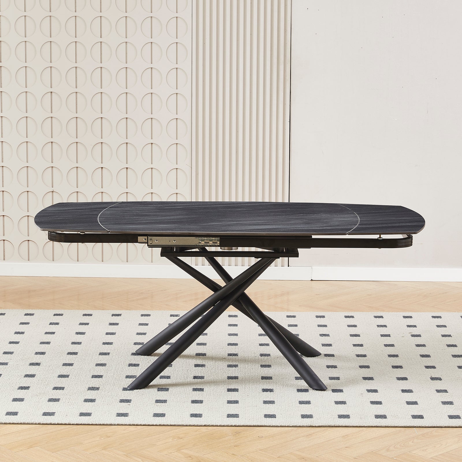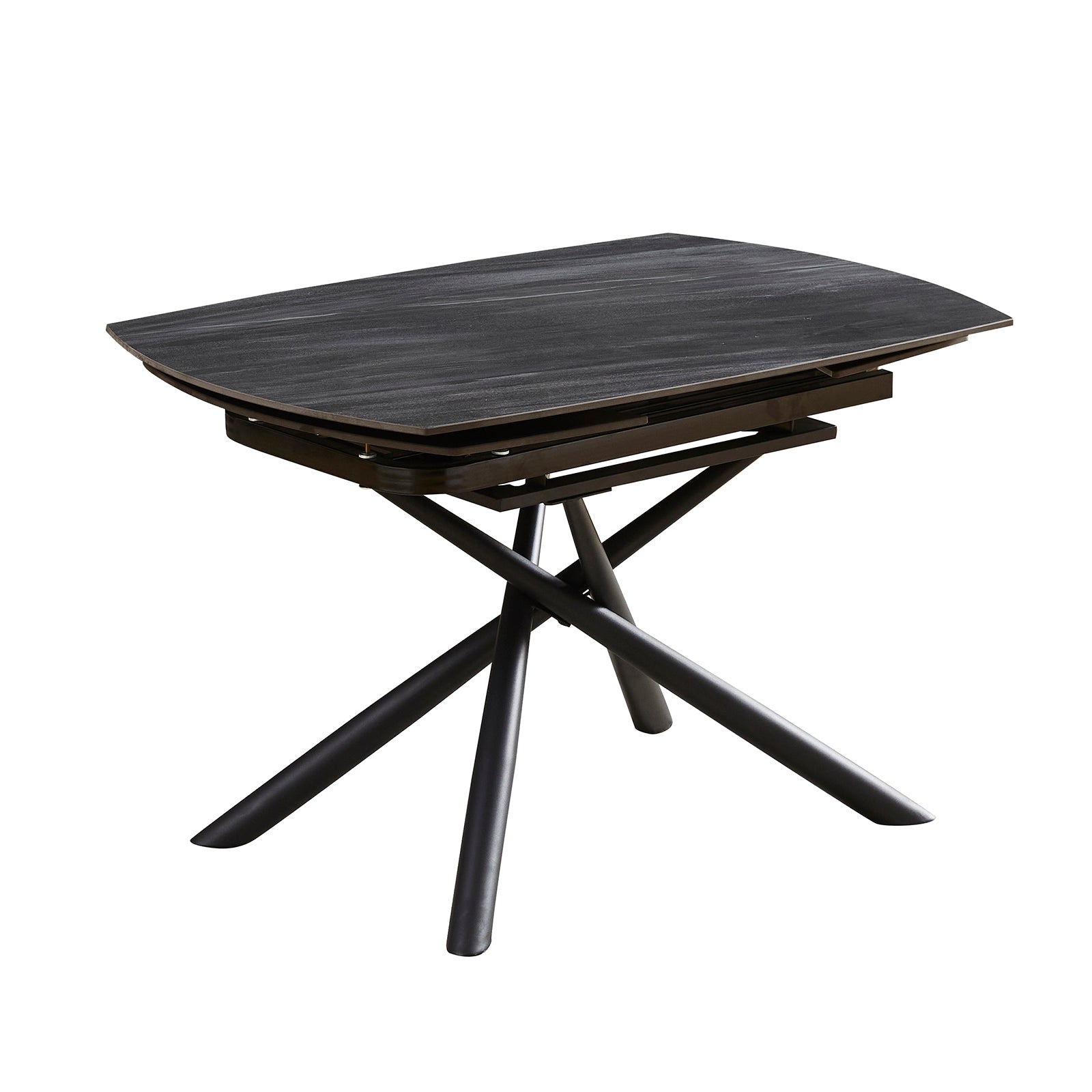 The stunning Lunar extending dining table features a sintered stone top with a sleek grey finish, effortlessly combining elegance with durability. It’s convertible/extendable table: two curved extension leaves slide out from beneath the main top on opposite sides, allowing the surface to expand when needed. The base is a sculptural black metal pedestal with angled legs that splay outward, giving it a stable yet elegant look. The pedestal design keeps legroom open and uncluttered. Overall, the table feels contemporary and refined, blending clean lines with a functional, space-saving mechanism-well suited for a modern dining or living area.