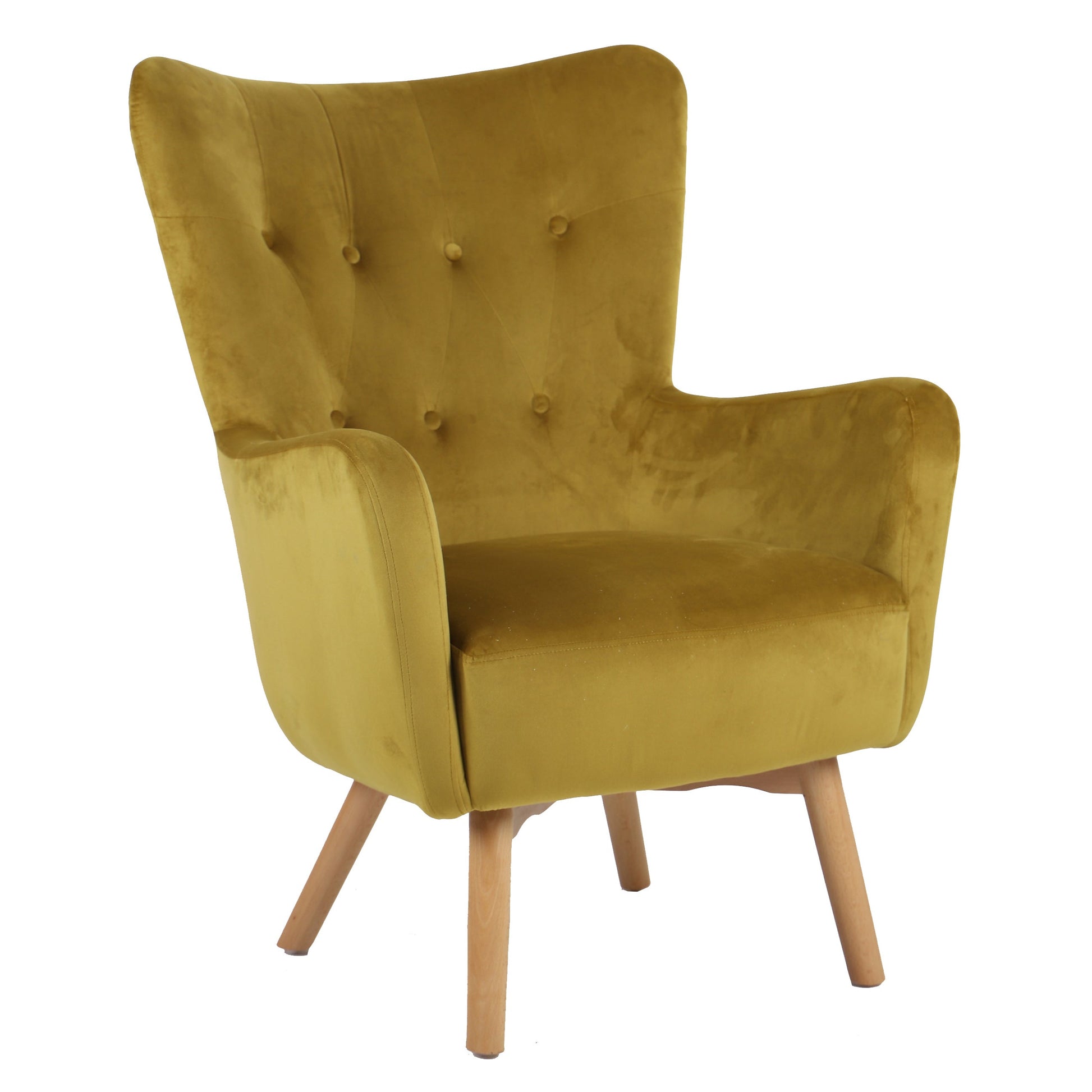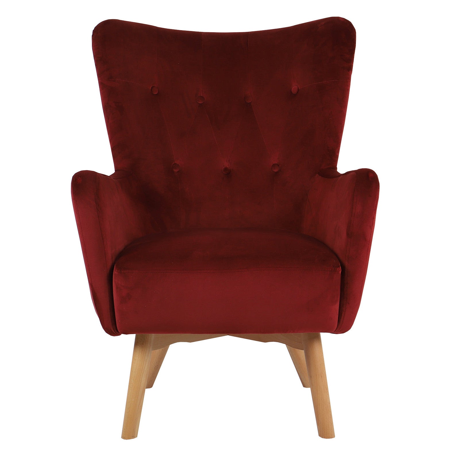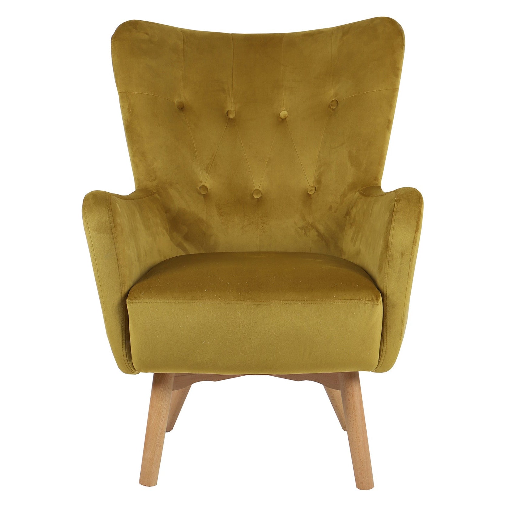 This exquisite chair will lend itself perfectly to a modern or traditional setting. It’s shape emulates the wings of an angel and its curved back is accented with button tufting. It really makes a feature of its tapered legs and wooden base, creating an overall style that is both impact full and elegant. This chair is finished in two contemporary colours, mustard and red.