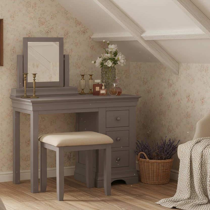 This elegant and sophisticated dressing table is beautifully finished to induce an air of calm and has three drawers to keep all your styling essentials, make-up and accessories neatly stored. The expansive surface offers plenty of room for the matching mirror from the range. Our much-loved Province collection is characterised by its timeless design, understated grey or white painted finish and light contemporary touches. It’s handcrafted with mortise and tenon solid wood frameworks for long-lasting durability and dovetail jointed drawers for added strength. And don’t forget, as well as the mirror, there is also a matching stool available so you can put together a complete look.