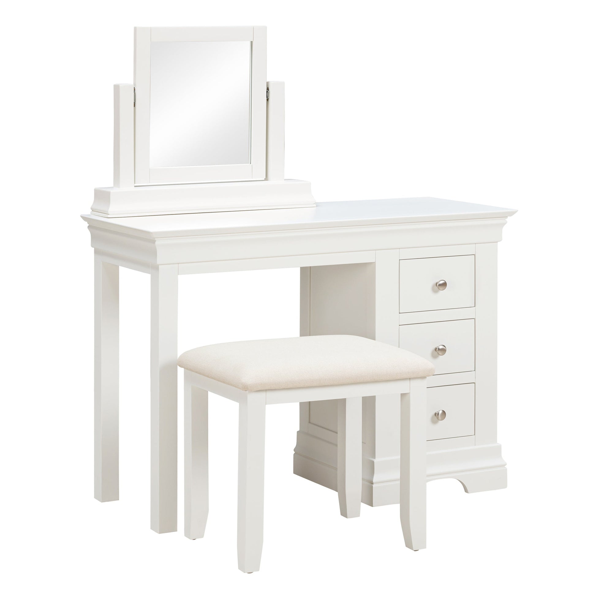 The perfect finishing touch to our Province dressing table, this sturdy matching stool has a fabric covered padded seat so that whether you’re putting your make-up on or taking it off, you’ll be doing so in comfort. Our much-loved Province collection is characterised by its timeless design, understated grey or white painted finish and light contemporary touches. It’s handcrafted with mortise and tenon solid wood frameworks for long-lasting durability and dovetail jointed drawers for added strength. And don’t forget, as well as the stool, there is also a matching mirror and dressing table available so you can put together a complete look.
