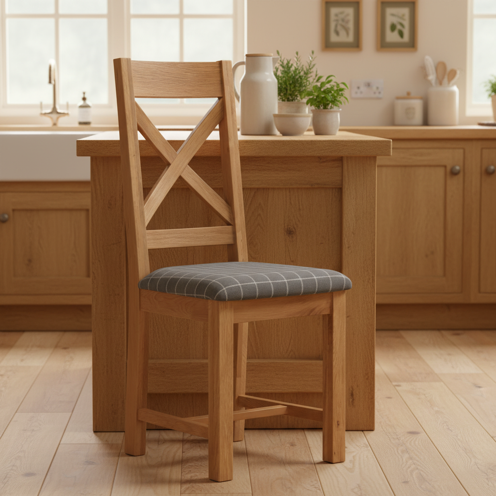 An elegant take on contemporary farmhouse style, our Oak Saoirse X-Back dining chair is designed to be noticed. This beautiful oak dining chair brings a lavish and elegant style that will complement any home. With 100% wool upholstered seats, the quality runs through every detail. This is part of the fantastic Saoirse Oak Range of home furniture.
