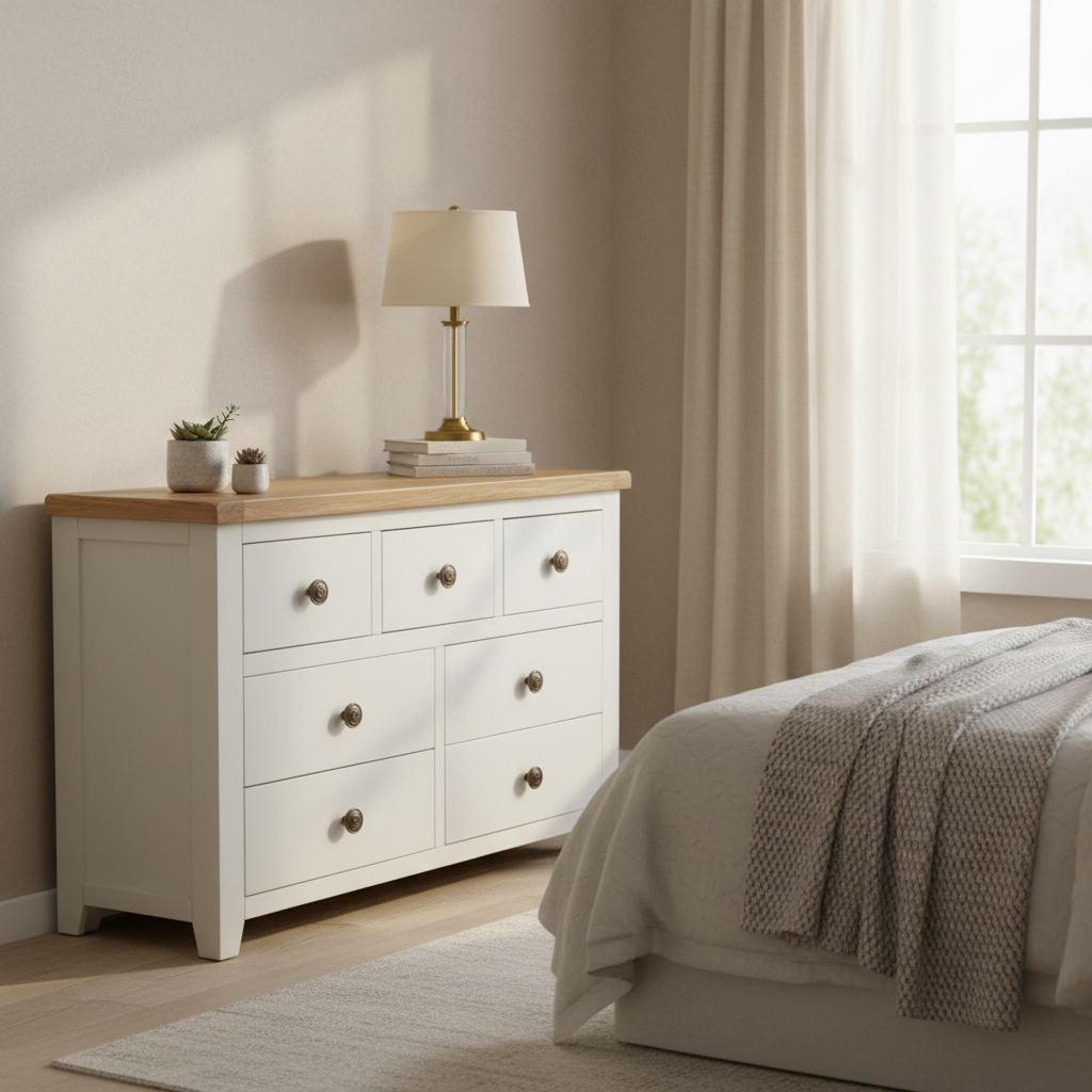 A sturdy piece of furniture, the Skellig 7 Drawer Wide Chest is made from solid painted cream hardwood and topped with natural oak. This stunning chest is designed to impress, with its modern feel, light painted finish and metal handles. There's ample space for cutlery and table linen in the drawers. The whole piece has a robust quality that will add character to your dining room, living room or bedroom.