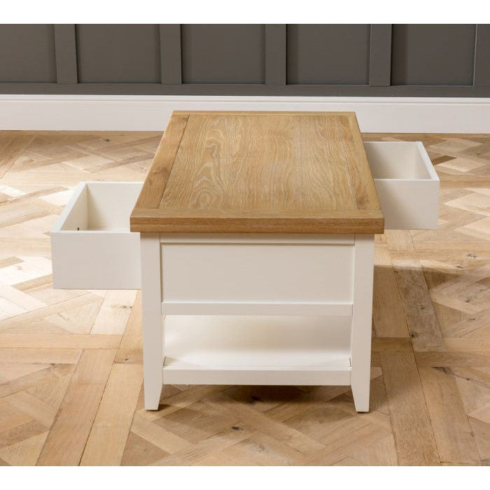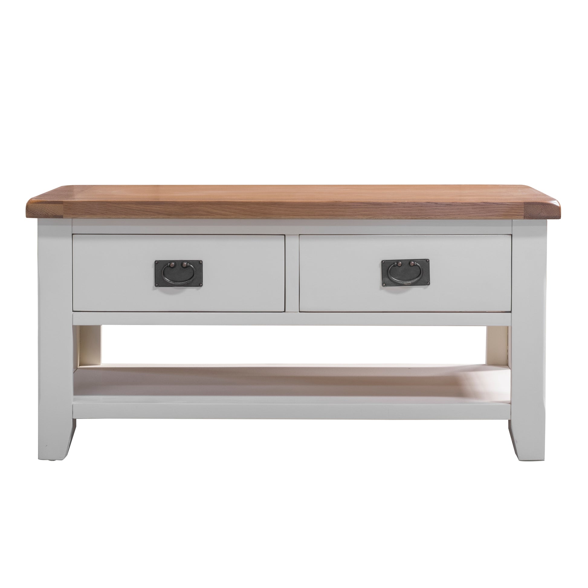 A sturdy piece of furniture, the Skellig Oak 2 drawer coffee table is made from painted solid hardwood and topped with natural oak. This stunning cream and oak table is designed to impress, with its modern feel, light painted finish. The whole piece has a robust quality that will add character to your dining room or living room.