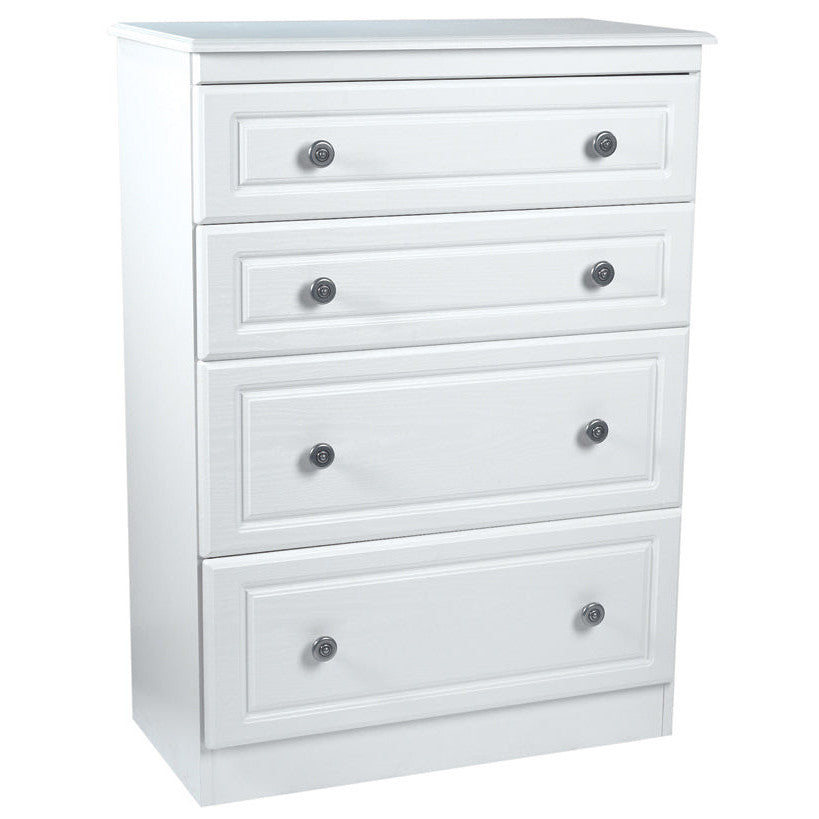 A stylish chest of drawers with crisp, clean edges the Snowdon four drawer deep chest is a perfect fit in any bedroom. This chest has plenty of storage with two jewellery drawers and two deep drawers beneath. It also compliments other bedroom furniture from the Snowdon White range. Subtle detailing results in a beautiful white chest of drawers which details wood effect drawers and tops. This quality furniture delivered fully assembled.