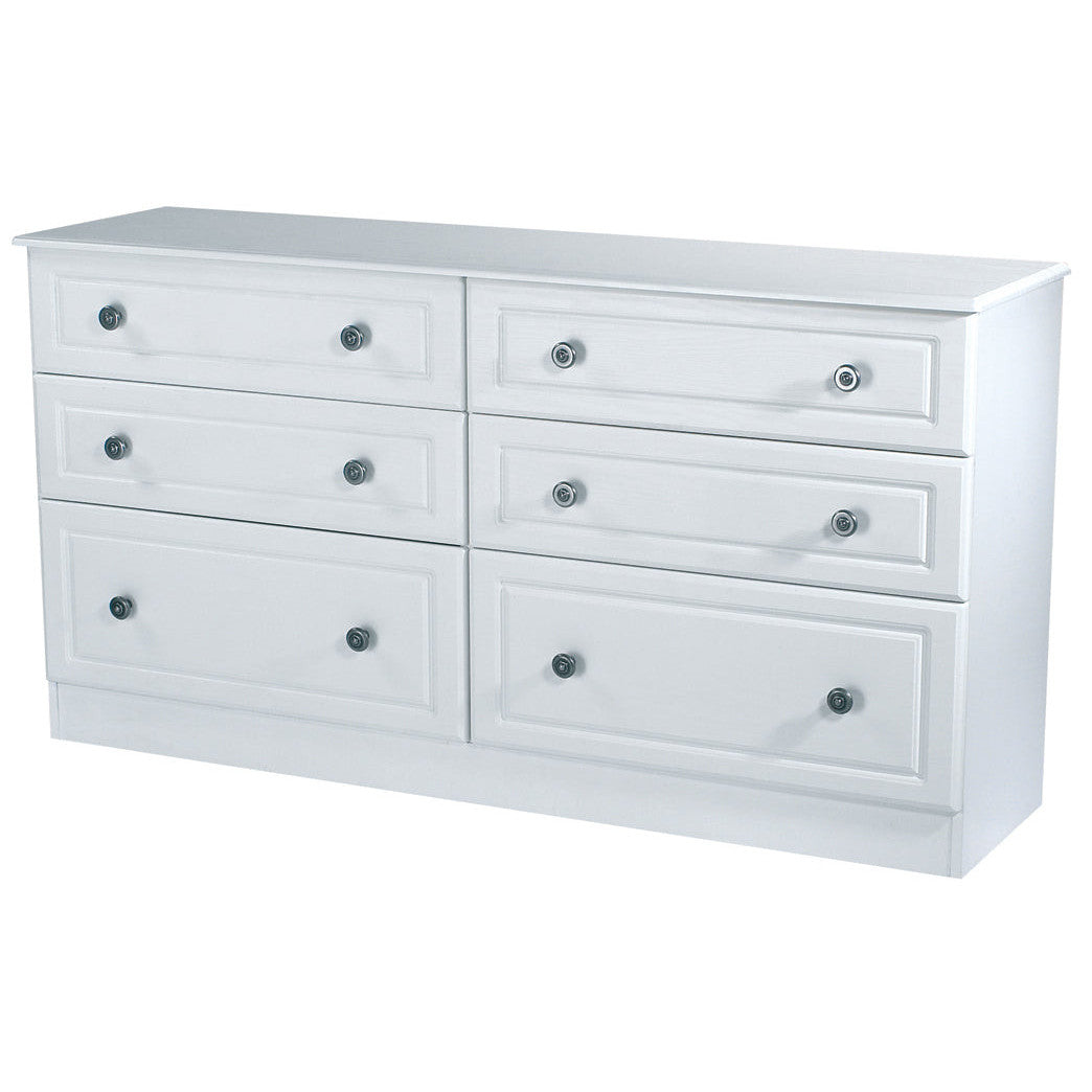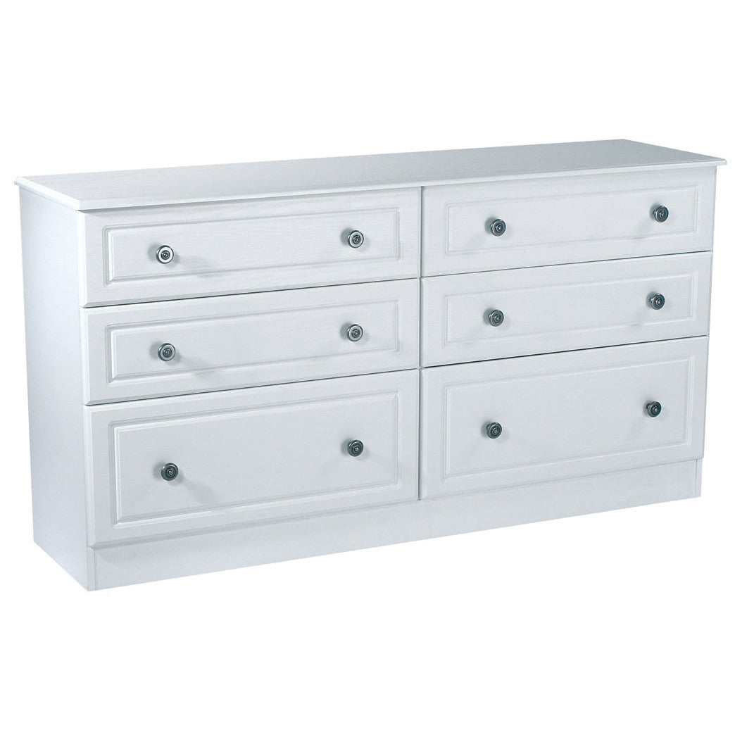 A stylish chest of drawers with crisp, clean edges the Snowdon six drawer long chest is a perfect fit in any bedroom. This chest has plenty of storage with 6 large drawers, three on either side. It also compliments other bedroom furniture from the Snowdon White range. Subtle detailing results in a beautiful white chest of drawers which details wood effect drawers and tops. This quality furniture delivered fully assembled.