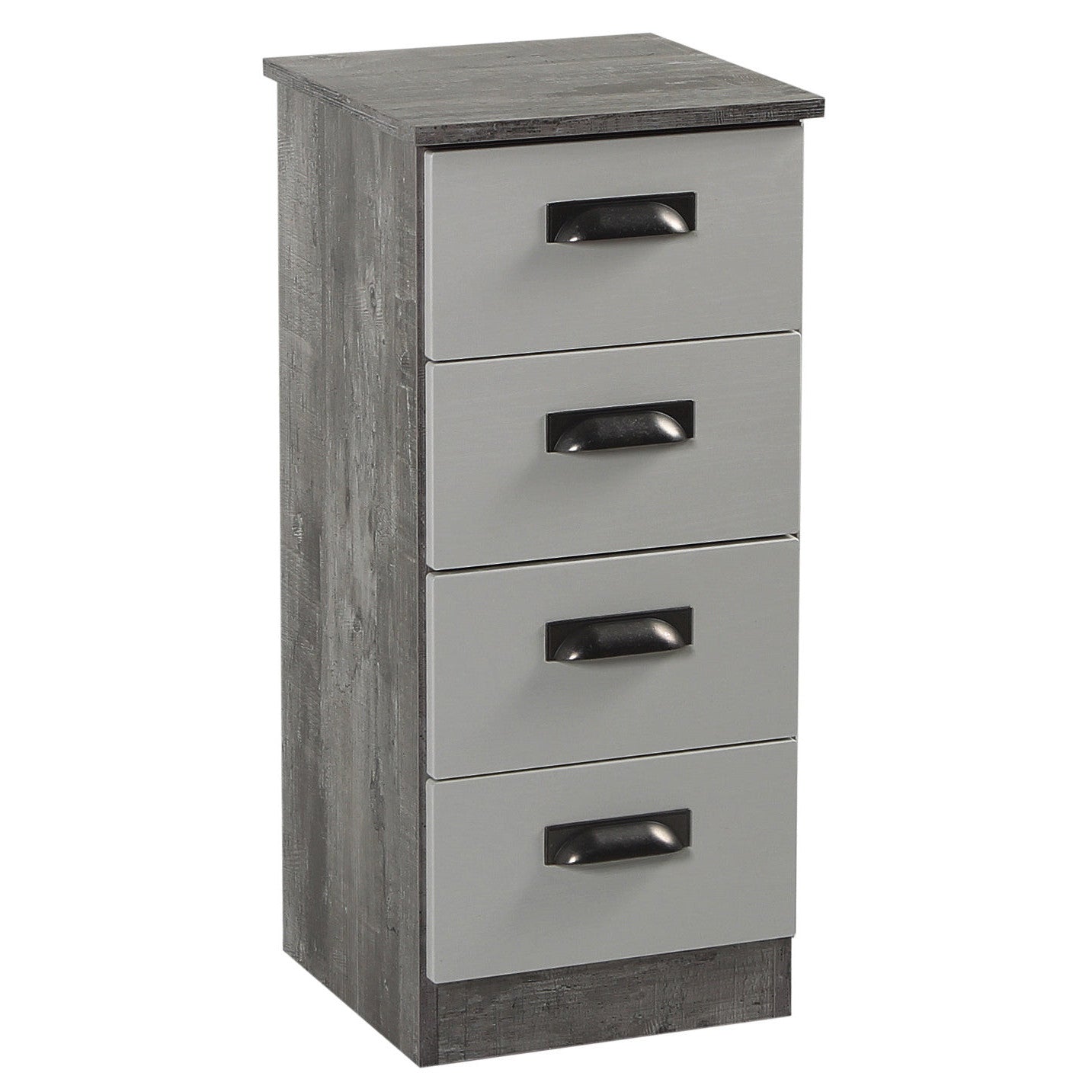 The contemporary Vogue Four Drawer Locker gives a fresh urban look to the bedroom. It is finished in concrete with light grey on the drawer and door fronts. A heavy brass cup handle gives that urban style to your bedroom. The carcass is crafted from concrete look melamine with a light grey wood grain on the fronts. This collection will work perfect with neutral colour schemes. Also available in an all concrete colour. This quality furniture delivered fully assembled.