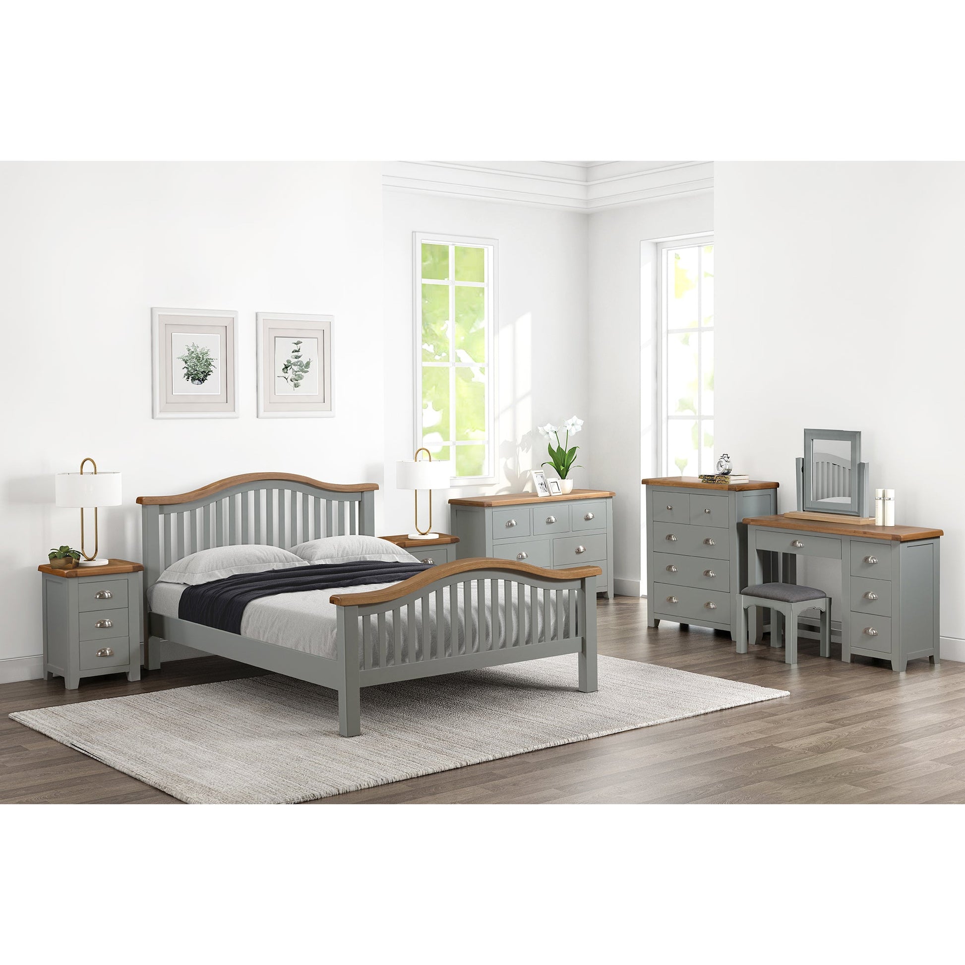 With a striking mushroon grey colour, oak effect tops, soft rounded edges, chunky strong lacquered frames and chrome effect cup styled handles. The Capri Bedroom Collection is the perfect addition to any style conscious home owner. This collection with its muted two tone shades will add an uplifting look to any home. The complete Capri Mushroom Grey Bedroom Collection is available to order.